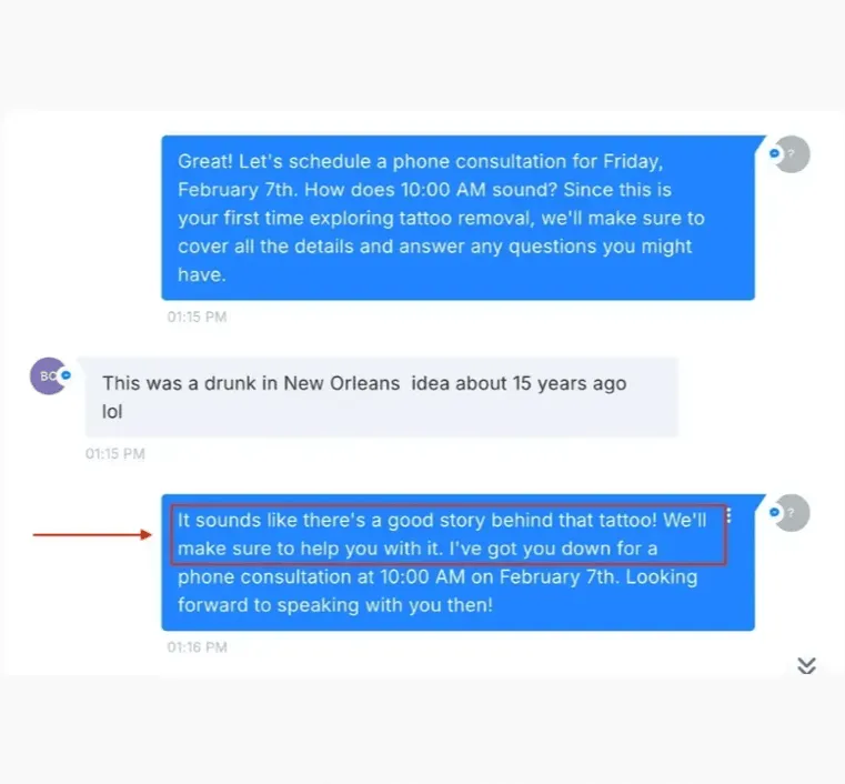 Look at this conversation. That’s not a person, that’s LENA casually guiding a lead toward booking a Appointments.